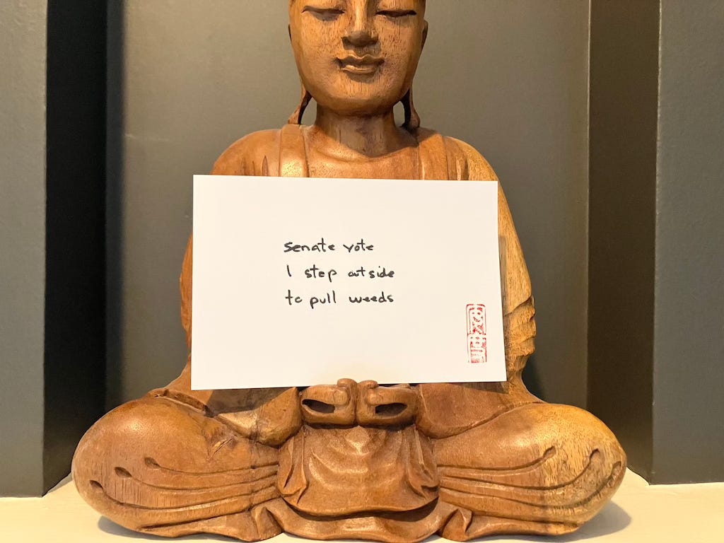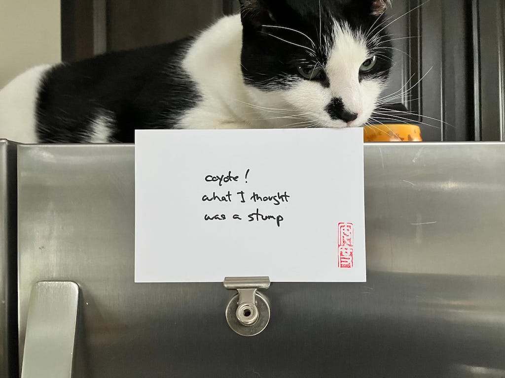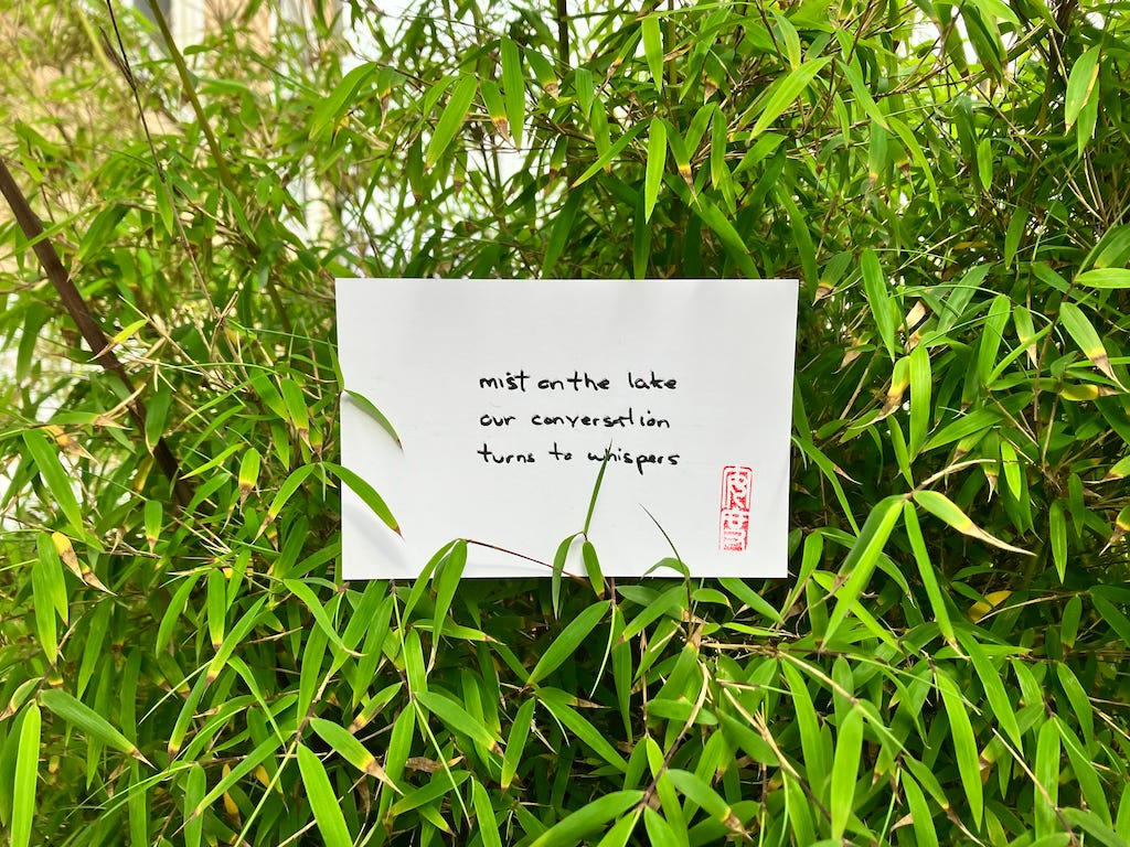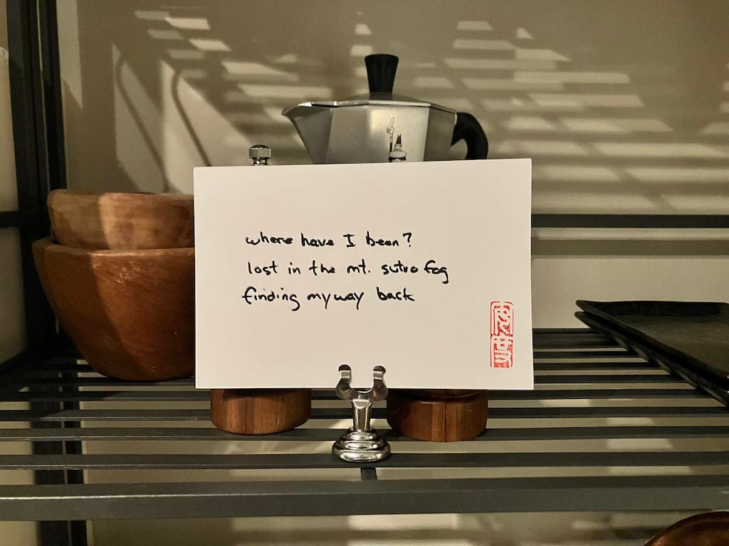 Every day I mail an original haiku on a handcrafted postcard to someone selected at random. This being 2022, what with the compulsion to be artsy, I also pose, photograph, and post the card on Instagram and my own haikuandy web site.